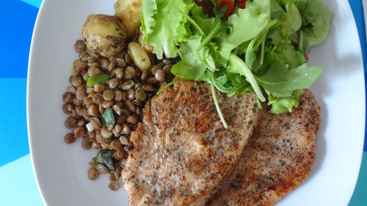 1. Morčací steak so šošovicou a šalátom