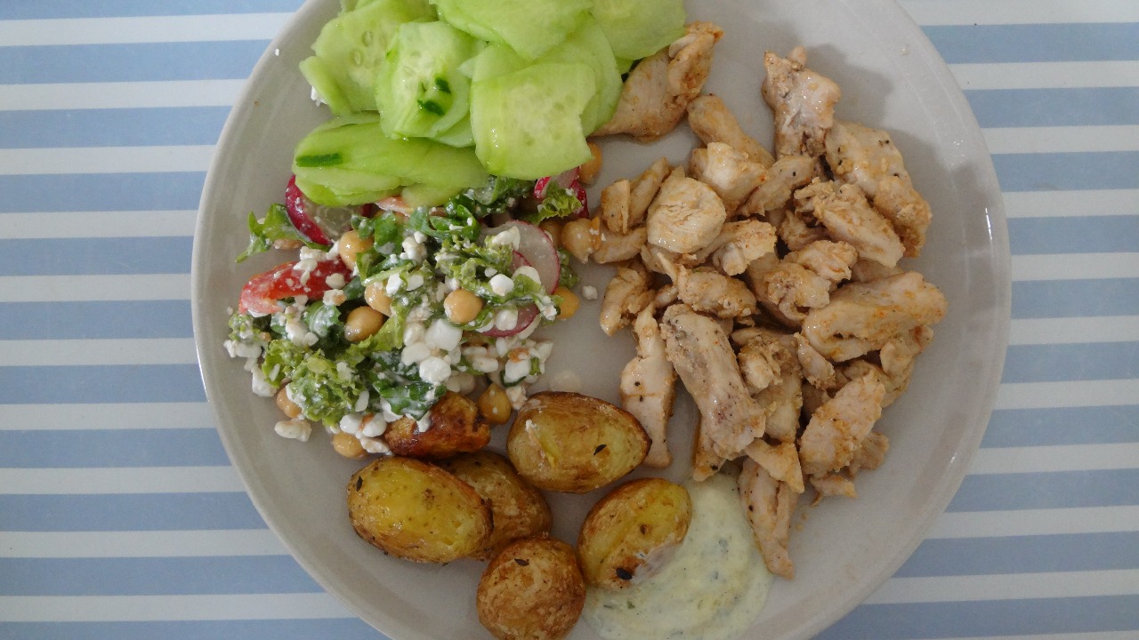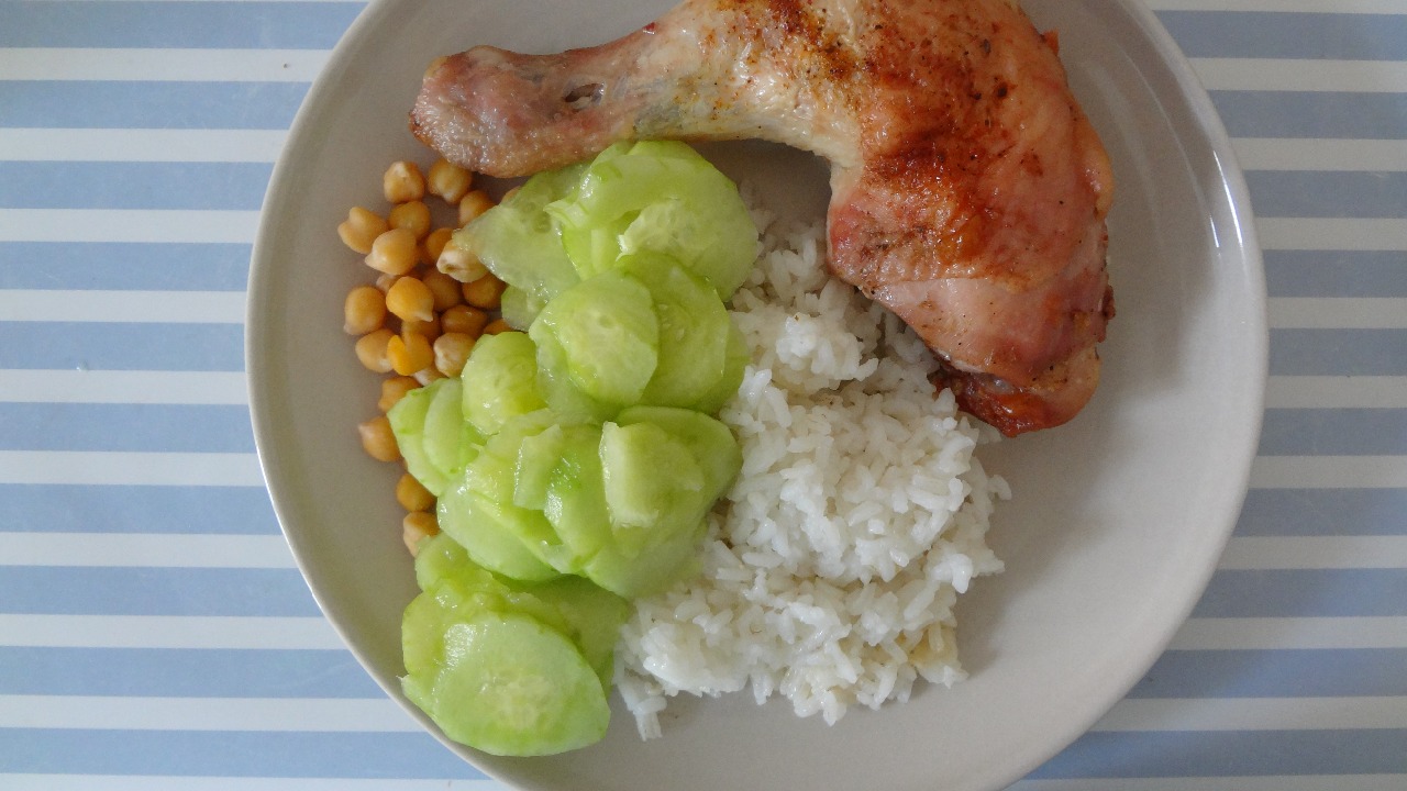 5. Pečené stehno s ryžou, cícerom a uhorkovým šalátom