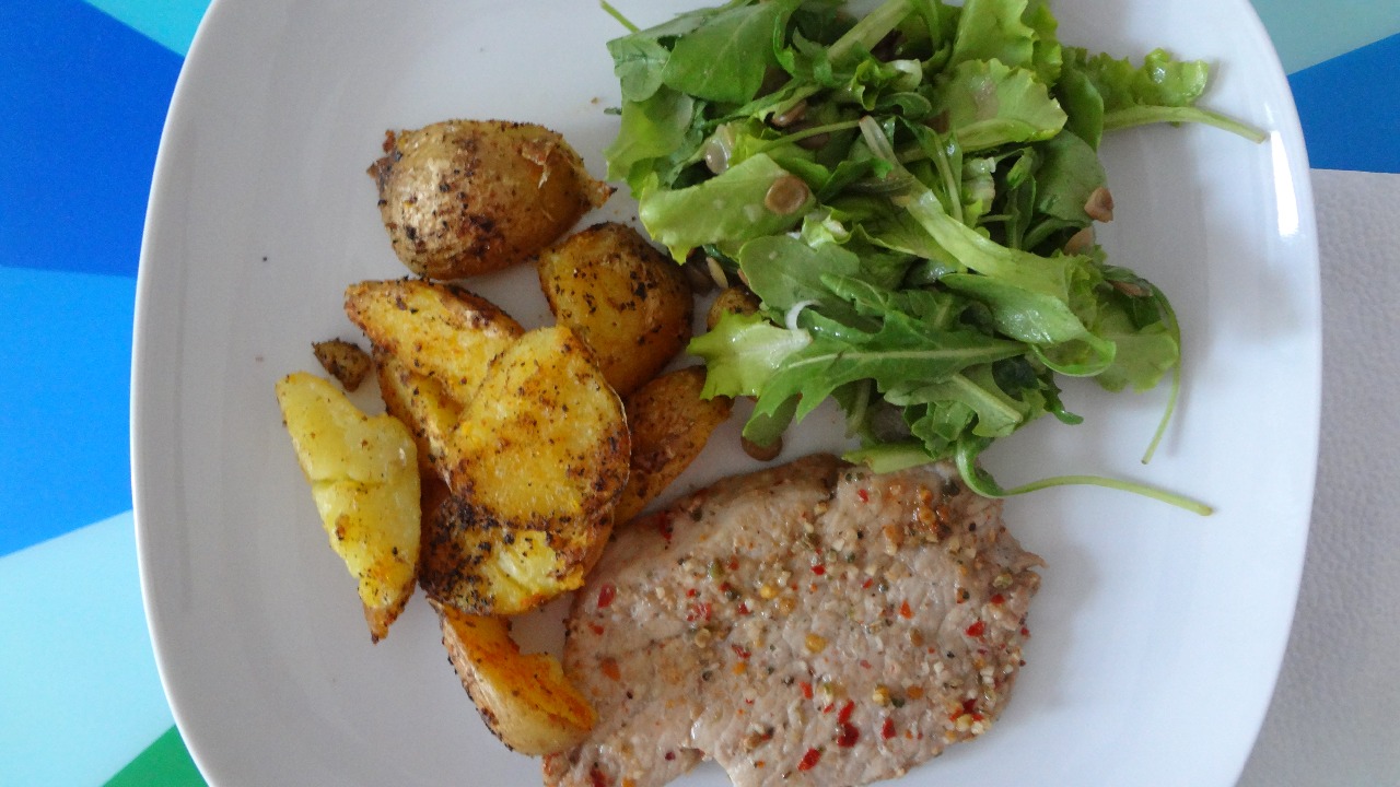 2. Morčacie kúsky s opečenými zemiakmi a šalátom