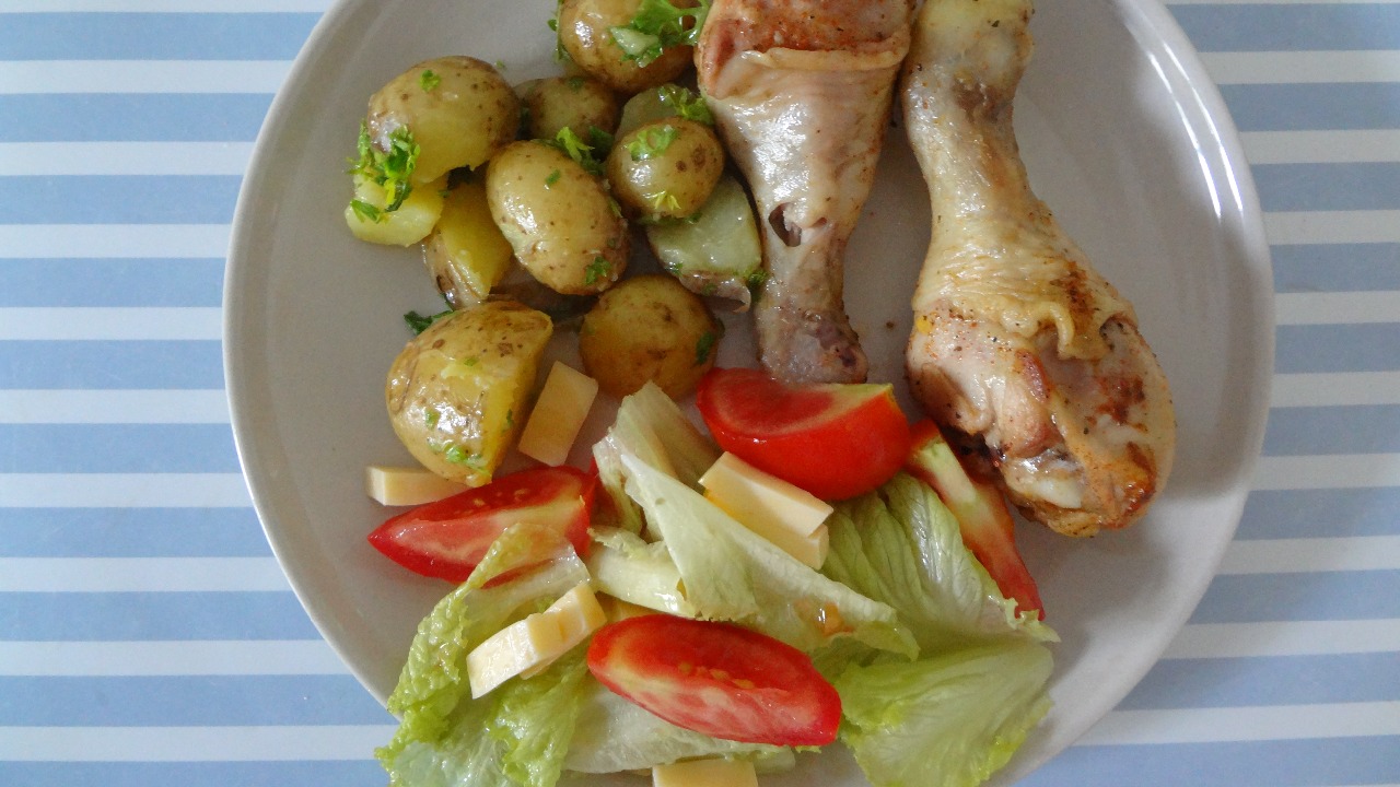 6. Pečené stehno s pečenými zemiakmi a šalátom